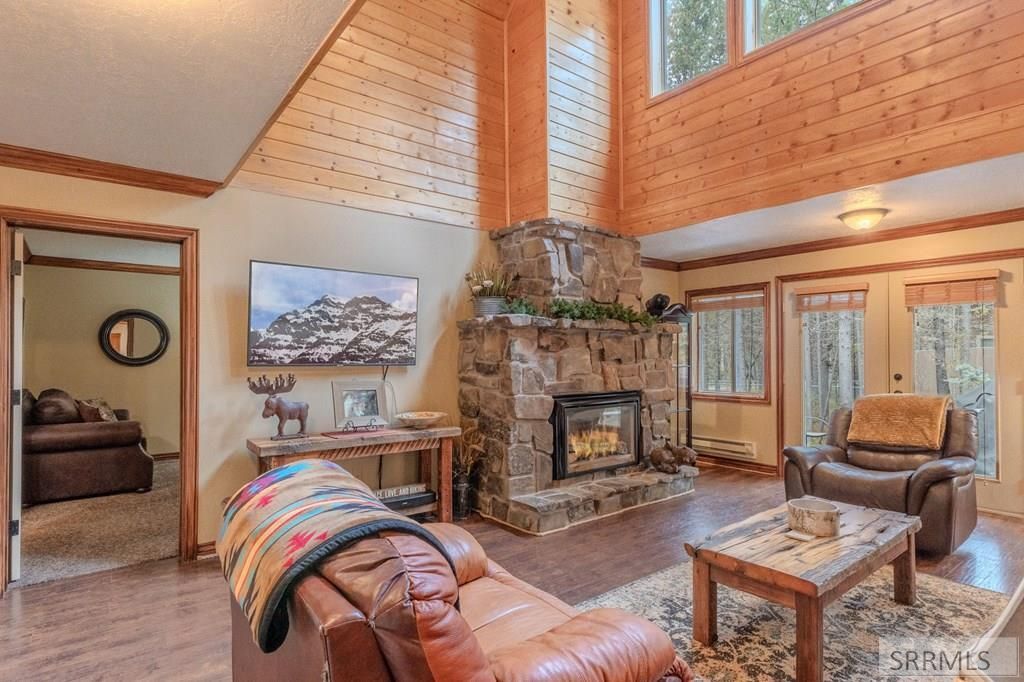 Tucked among the trees on highly sought-after Bills Island, this inviting 3-bedroom, 3-bath mountain retreat offers the rare combination of privacy, comfort, and coveted Island Park Reservoir water access. The living room showcases soaring vaulted ceilings, luxury vinyl plank flooring, and a striking floor-to-ceiling rock fireplace with propane insert that anchors the space with warm mountain character. A spacious main-level primary suite provides a peaceful escape with a walk-in closet and relaxing soaking tub, while a convenient guest bath is also located on the main floor. Upstairs, two additional bedrooms, a full bath, and a cozy reading or TV loft create ideal separation for guests. Large closets throughout the home offer exceptional storage rarely found in cabin properties. Set on a beautifully wooded lot with a gravel driveway, the setting captures the quiet, natural feel that makes Bills Island so desirable. Whether used as a refined personal getaway or a part-time vacation retreat, this property offers access to one of Island Parks most exclusive waterfront communities with year-round recreation just outside your door. Call the listing agent today to schedule your showing.
